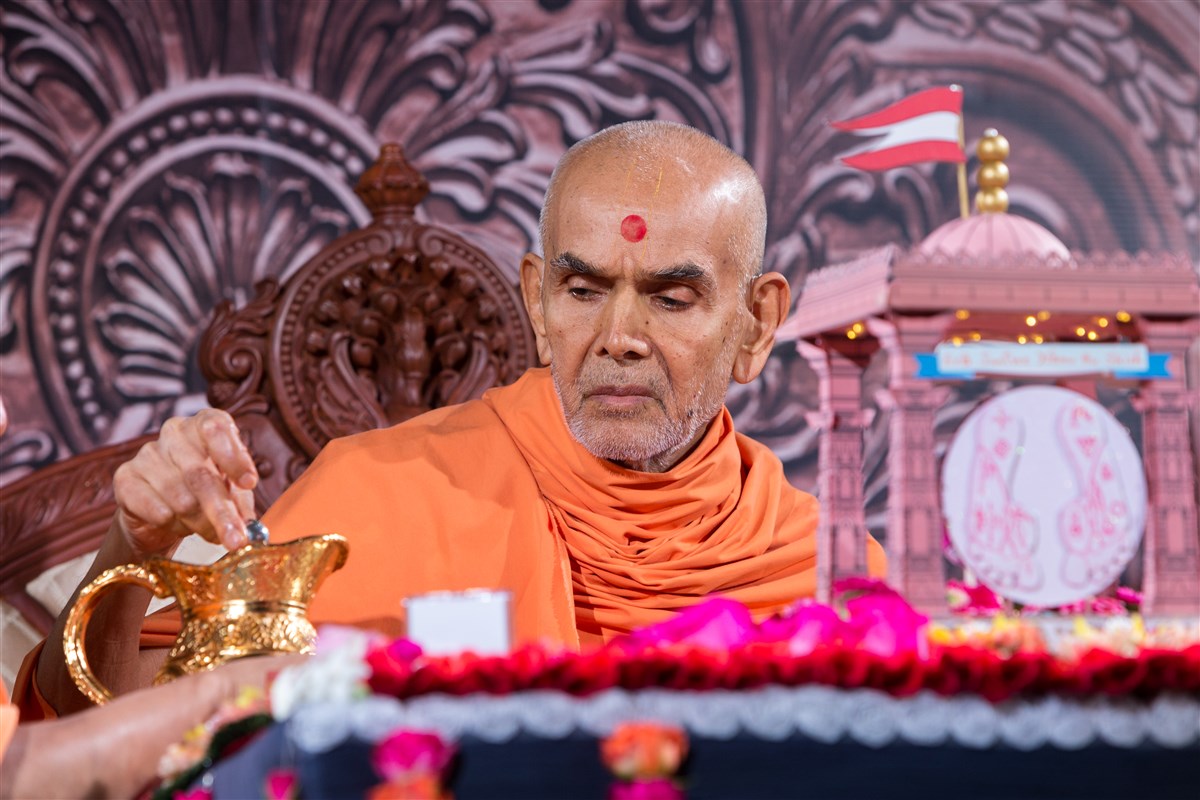 Swamishri sanctifies water with holy relics of Bhagwan Swaminarayan and the Guru Parampara