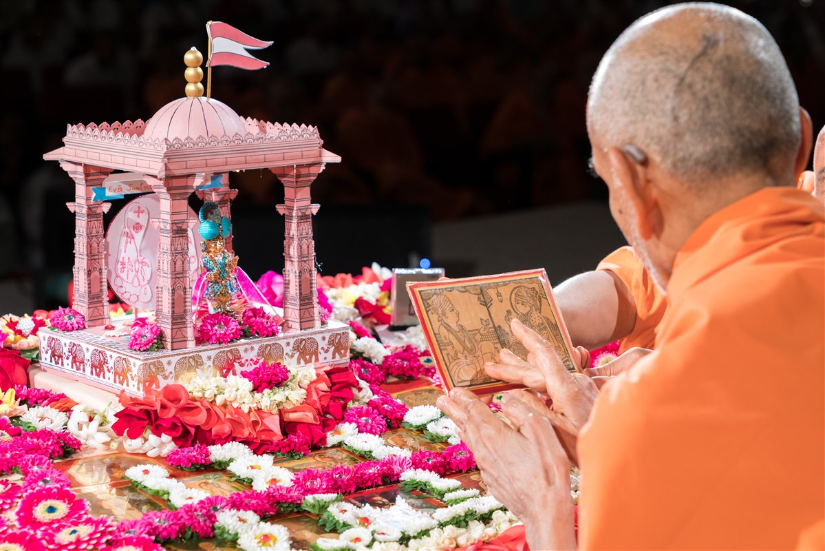 Swamishri engrossed in the darshan of Shri Ghanshyam Maharaj