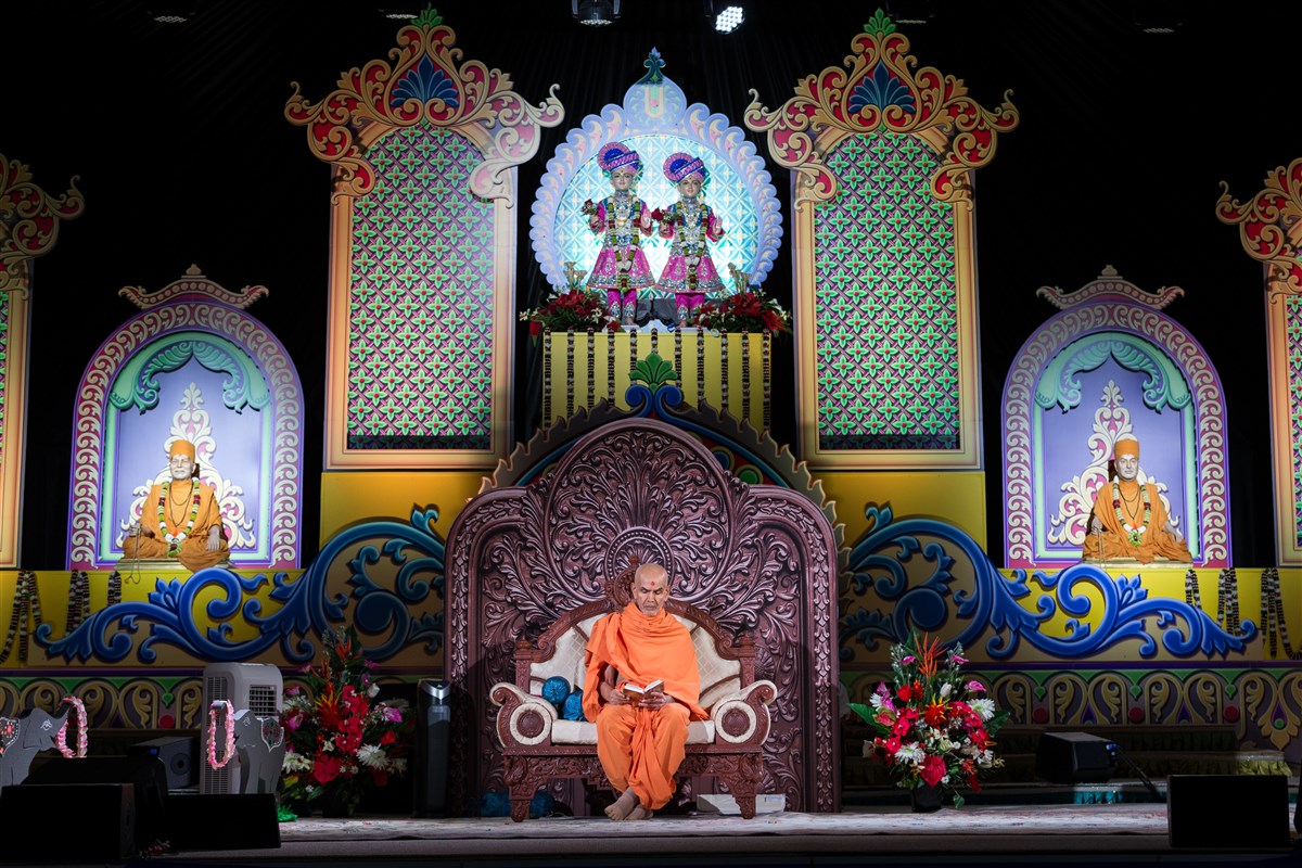 Swamishri arrives in the Yuvak-Yuvati Din asssembly