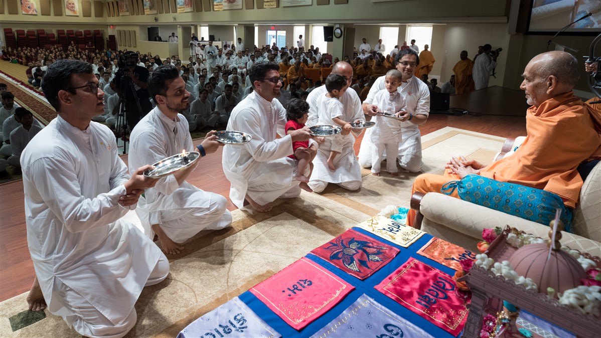Swamishri greets youths while holding Shri Harikrishna Maharaj