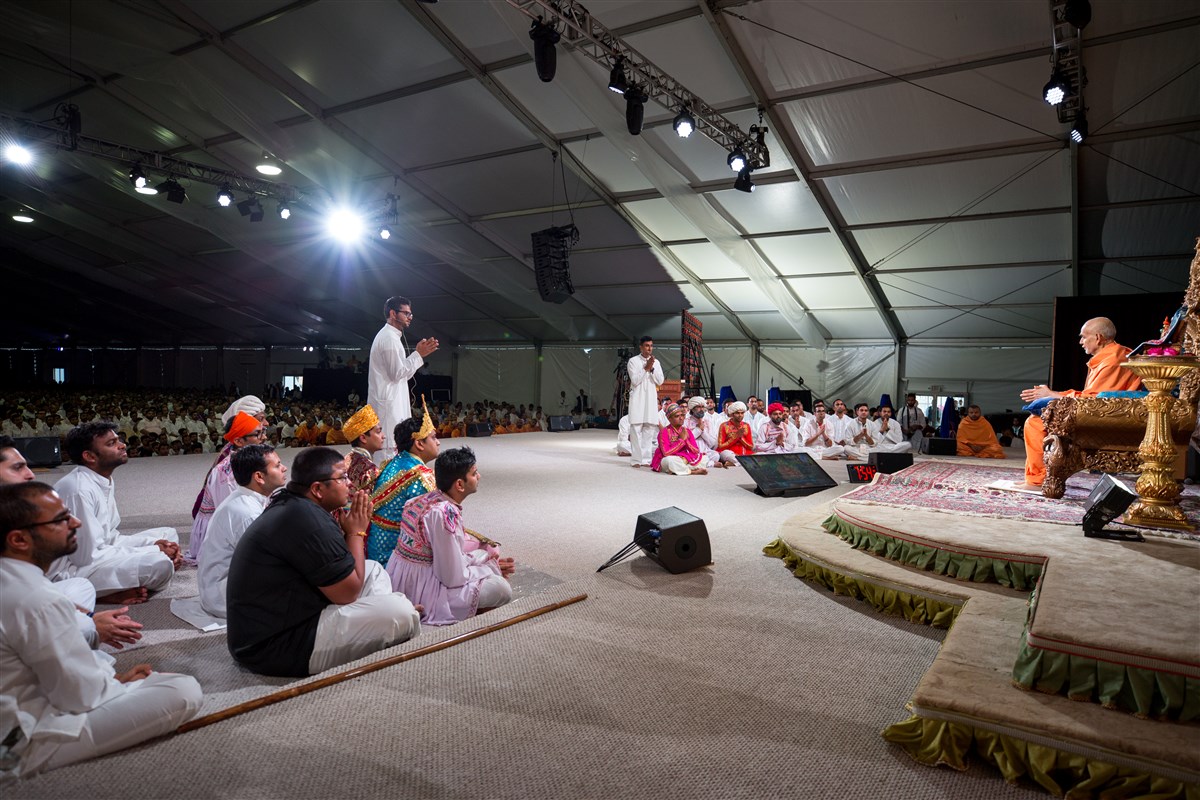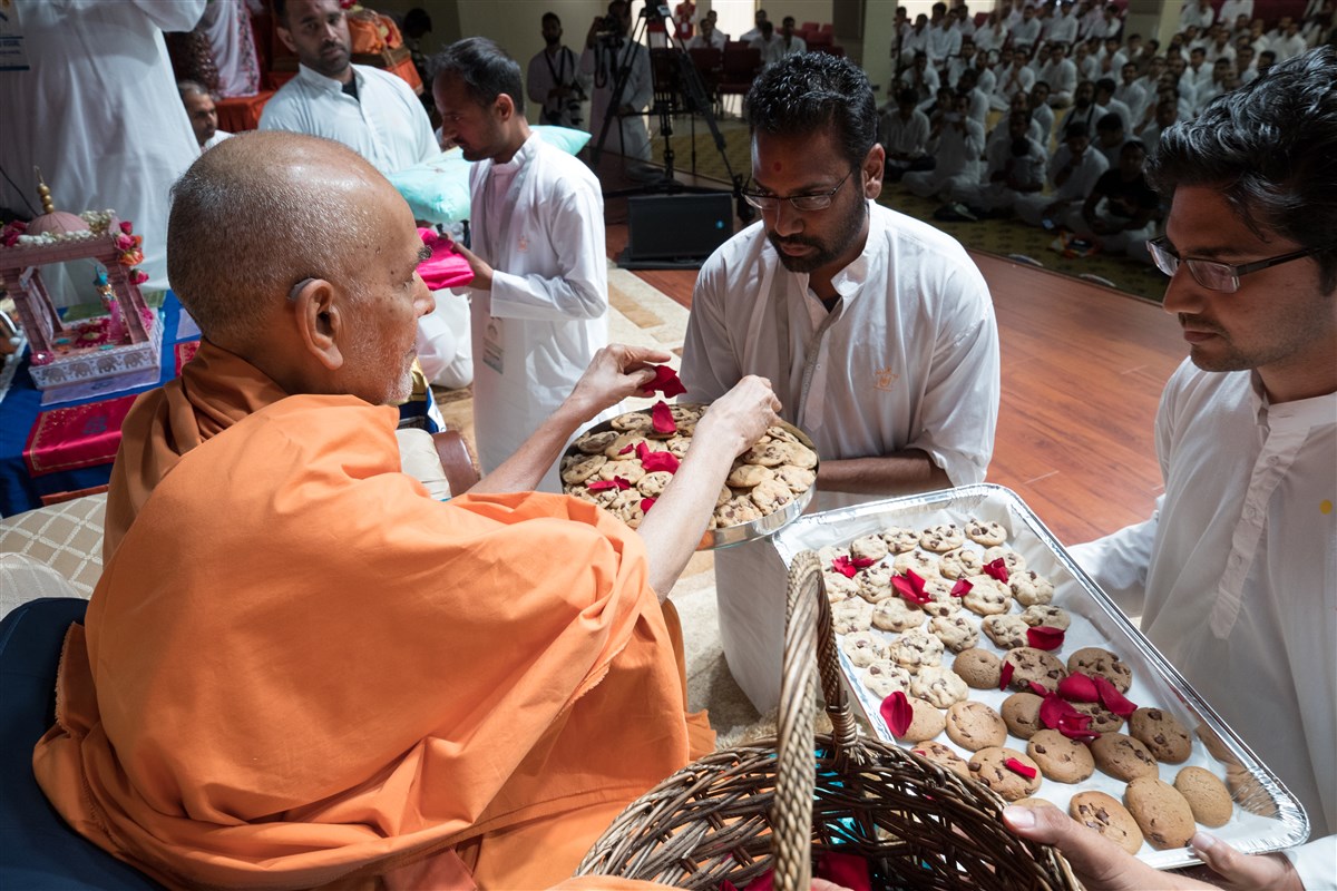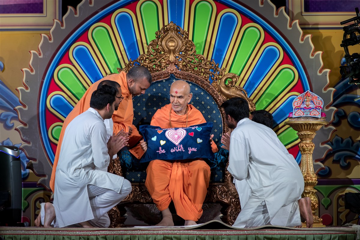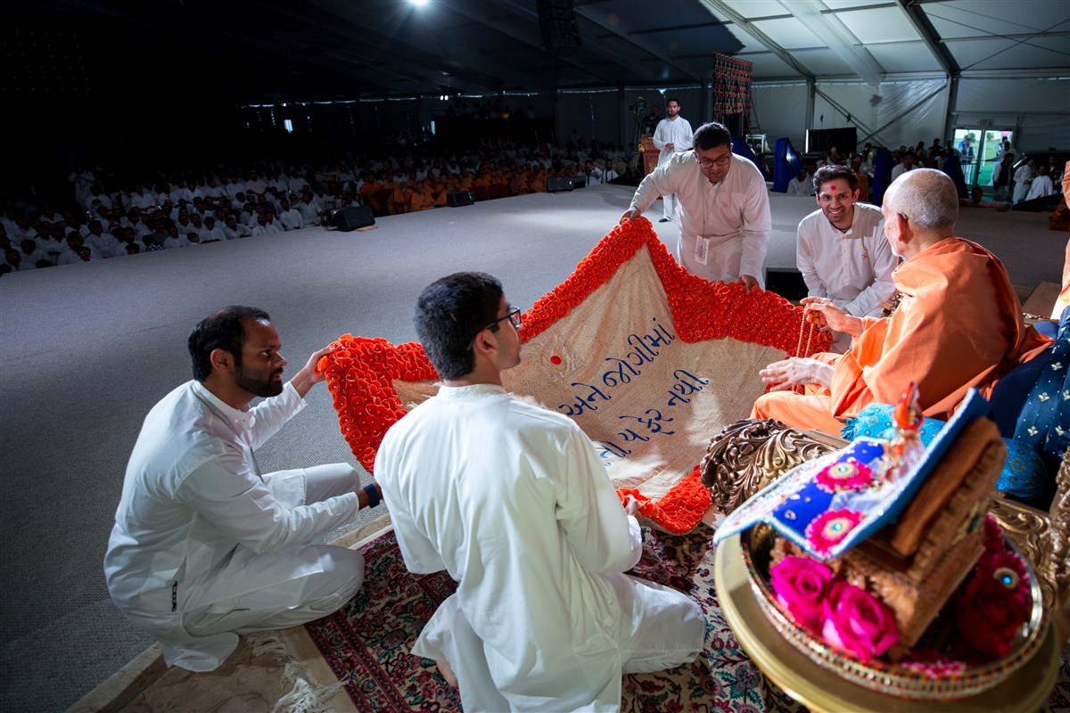 Pujya Bhaktivardhandas Swami garlands Swamishri with prayers from youths