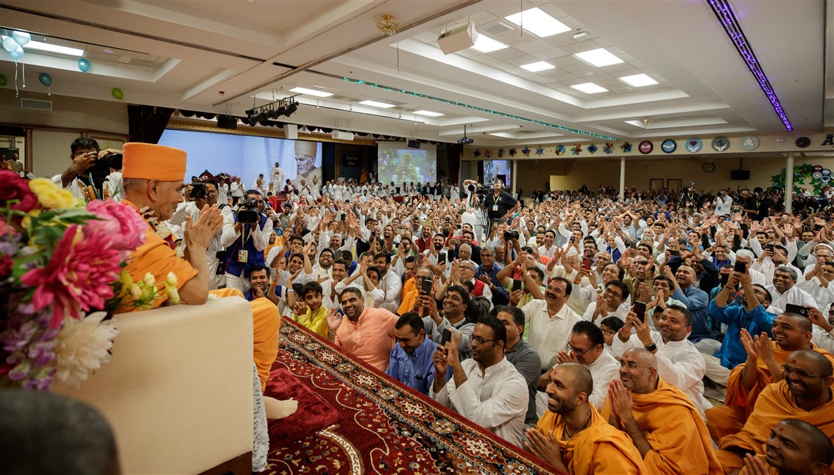 Swamishri greets the devotees in the audience with folded hands