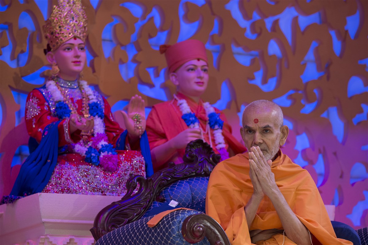 Swamishri greets the devotees with folded hands