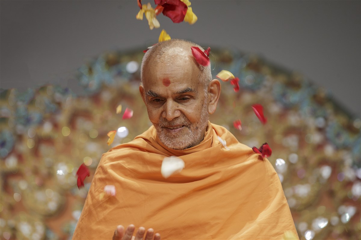 Swamishri showers flower petals on Pujya Ishwarcharandas Swami