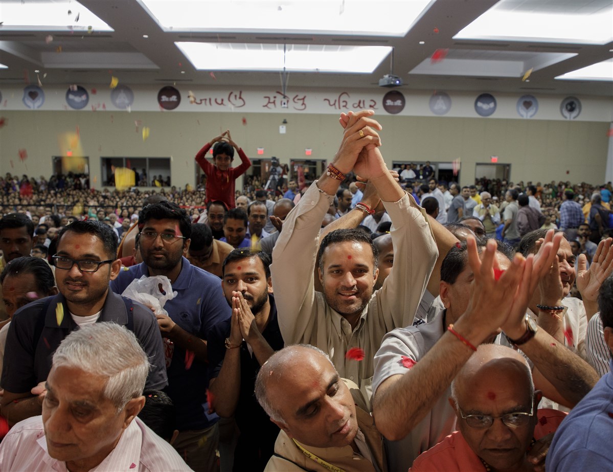 Devotees engrossed in 'pushpo ki holi' with Shri Harikrishna Maharaj