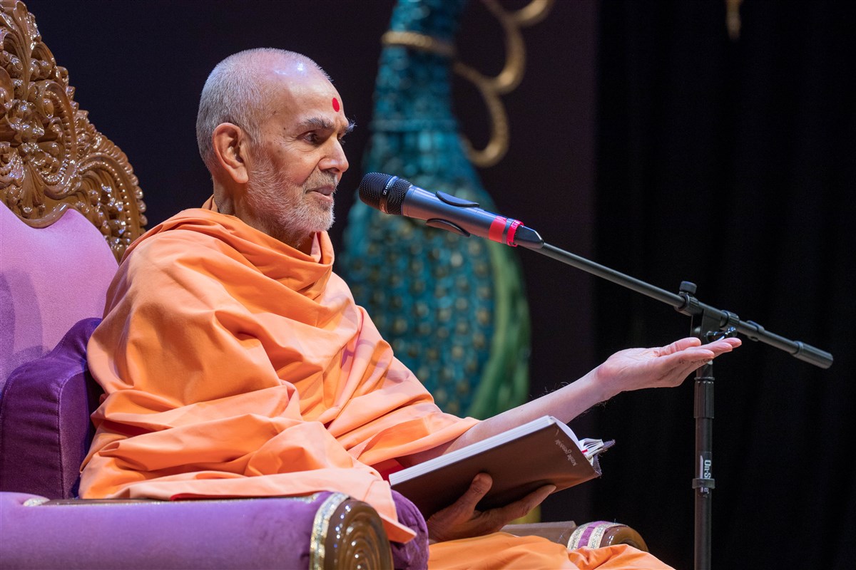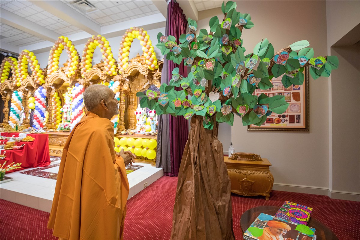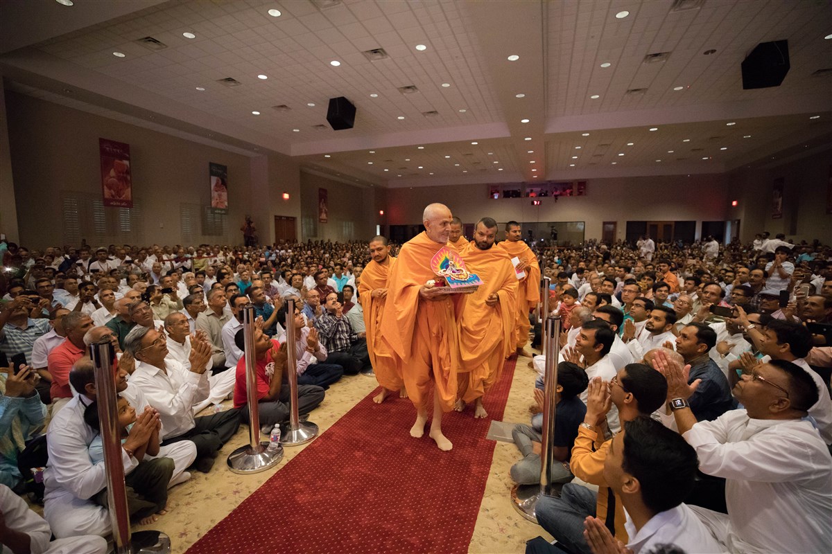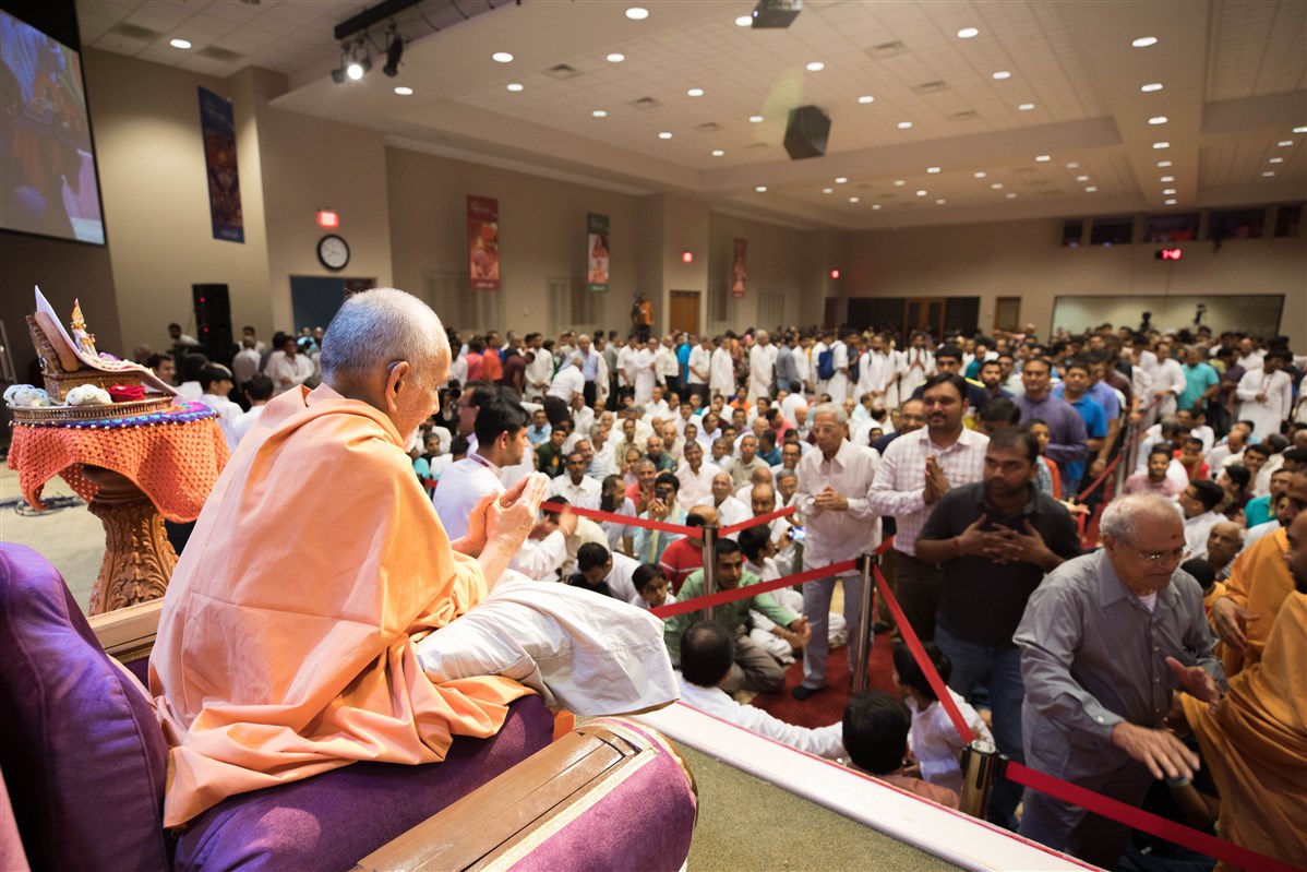 Swamishri greets devotees while holding Shri Harikrishna Maharaj