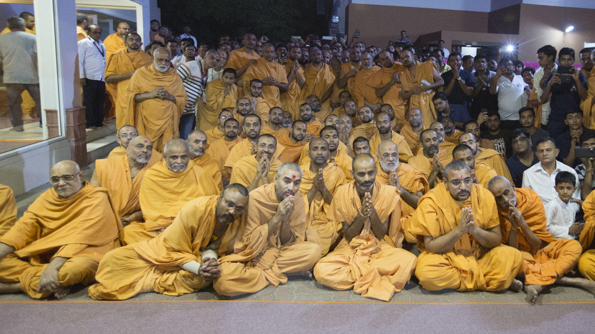 Sadhus and devotees doing darshan of Swamishri