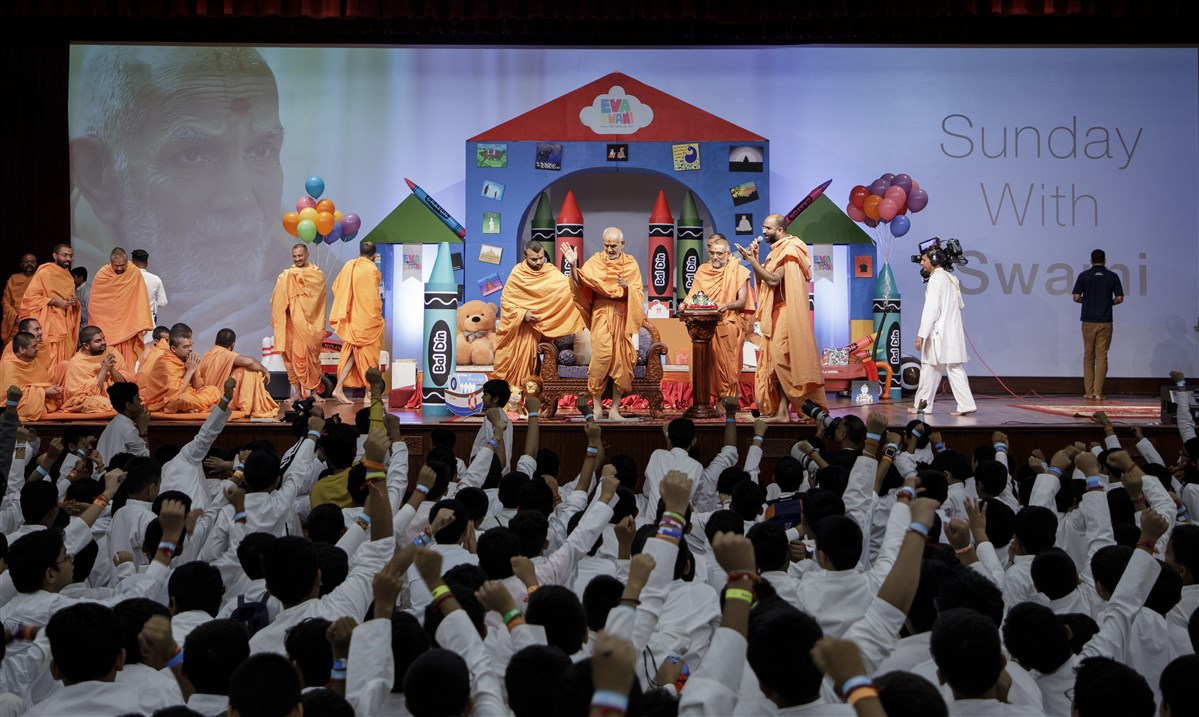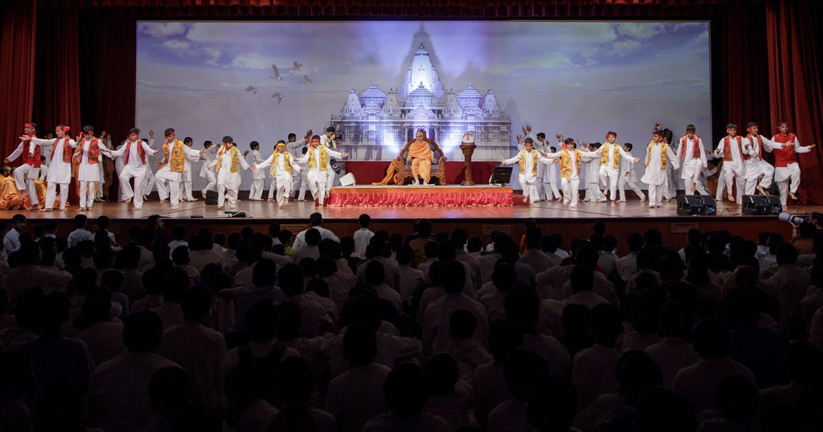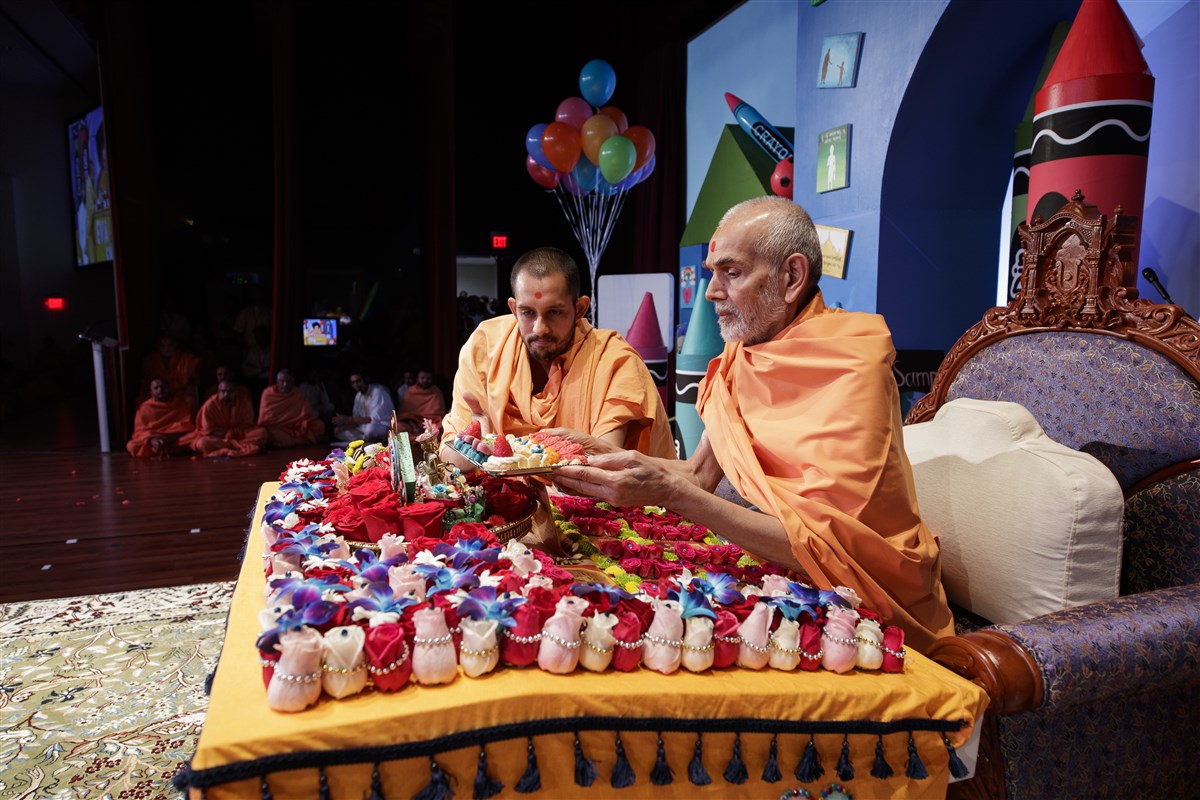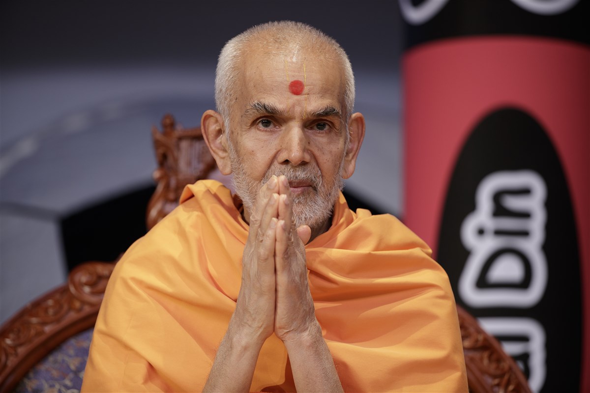 Swamishri blesses and honors Mahāmahopādyāya Pujya Bhadreshdas Swami for his recent creation of the Svāminārāyaṇasiddhāntasudhā, a vādagrantha that offers an exposition, justification, and defense of the Akṣara-Puruṣottama Darśana’s philosophical principles
