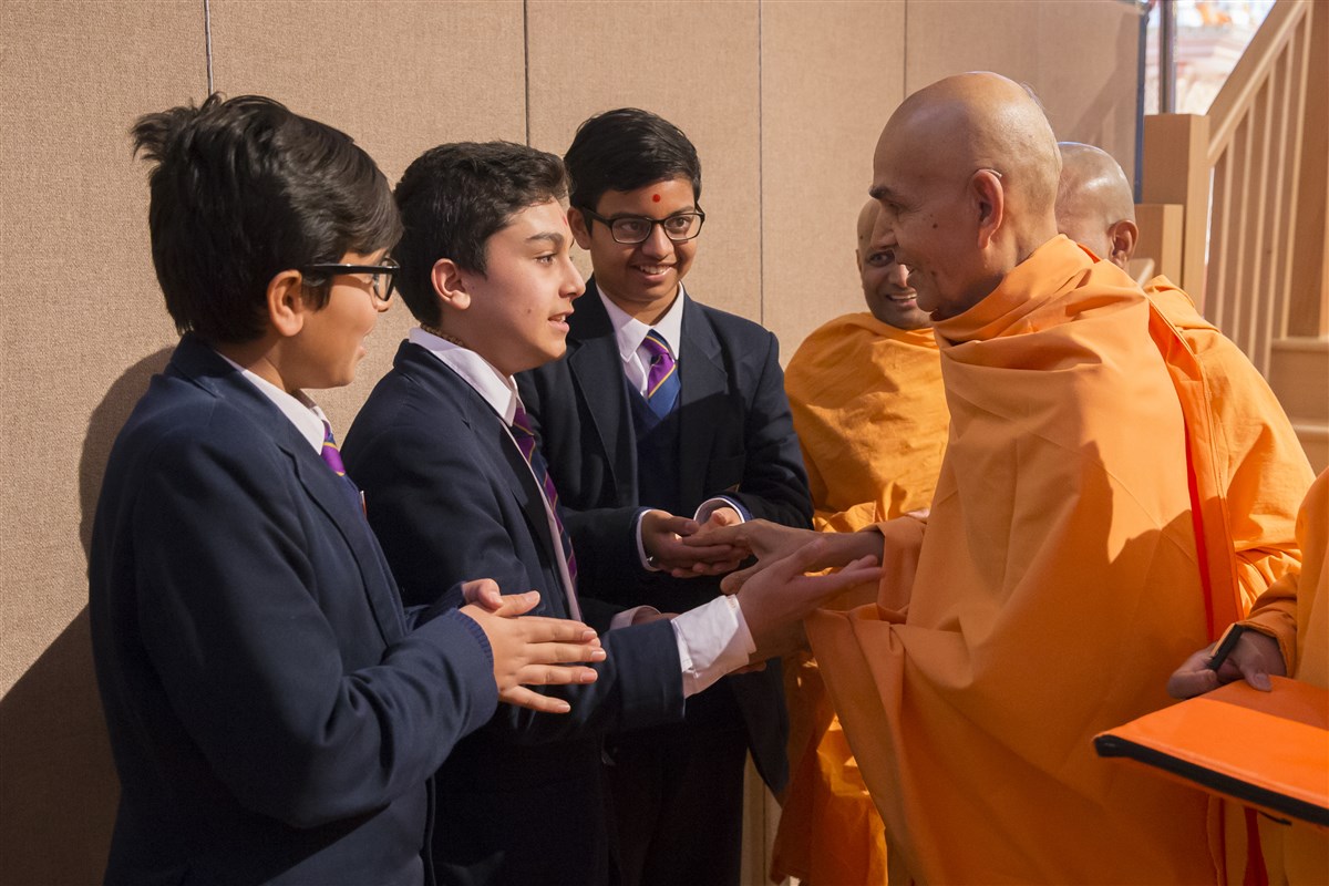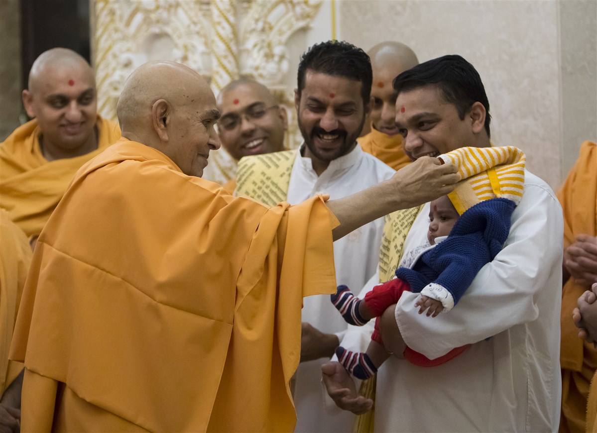 Param Pujya Mahant Swami Maharaj greets swamis with folded hands in the morning