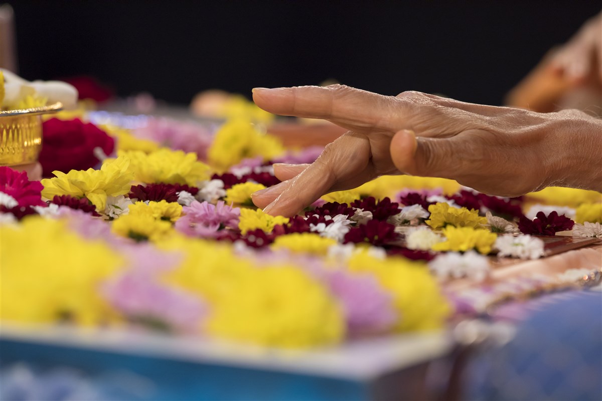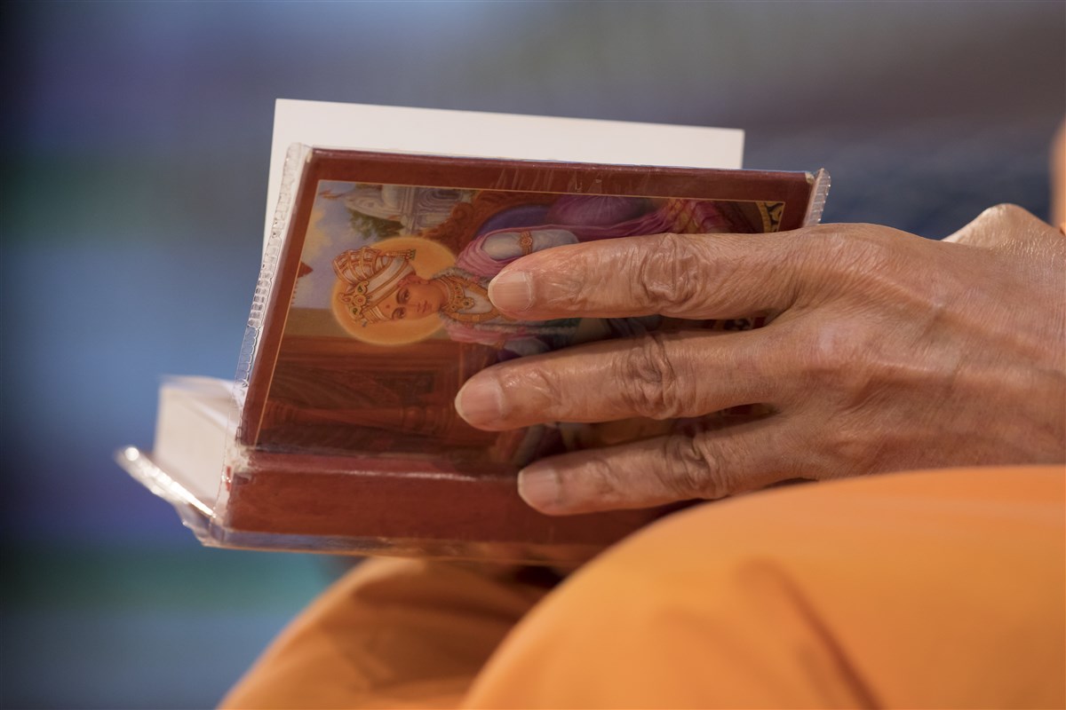 Swamishri holding the holy relics of Bhagwan Swaminarayan and the Guru Parampara