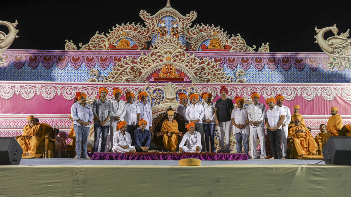 Pujya Bhaktipriya Swami honors Param Pujya Mahant Swami Maharaj with a garland