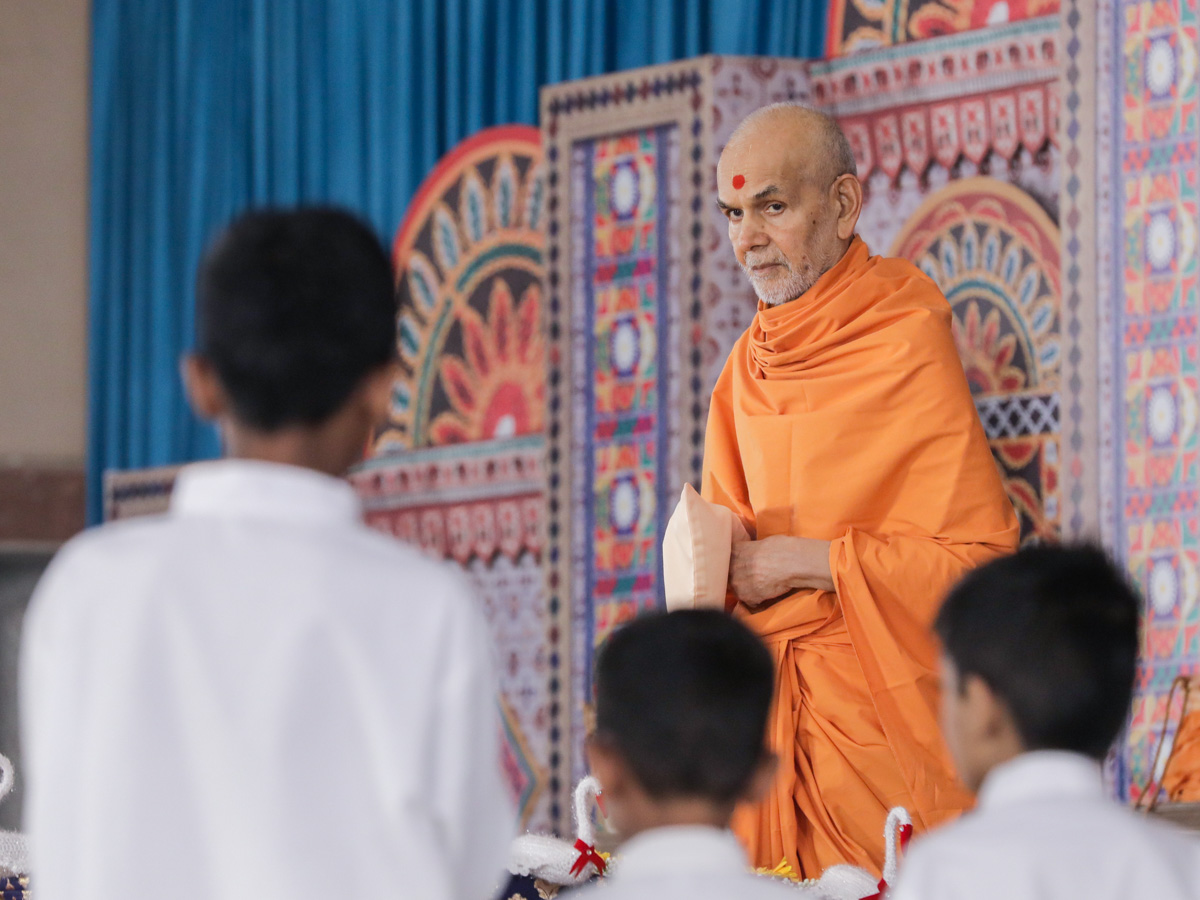 Swamishri greets devotees with 'Jai Swaminarayan' in the evening