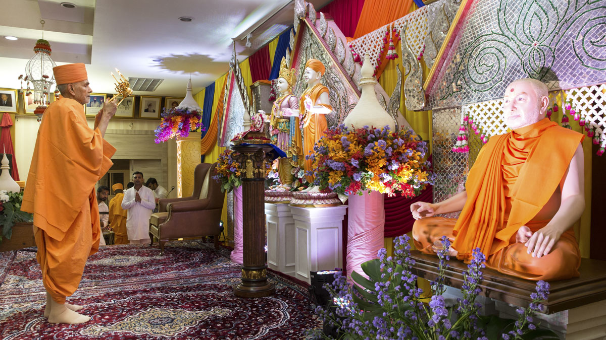 Param Pujya Mahant Swami Maharaj arrives for his morning puja