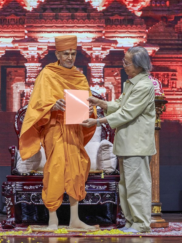 Swamishri greets Phra Maha Raja Guru Bidhi Sri Visudhigun, Chief Brahmin Priest of The Royal Court of Thailand