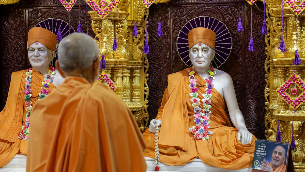 Swamishri engrossed in darshan of Shri Harikrishna Maharaj