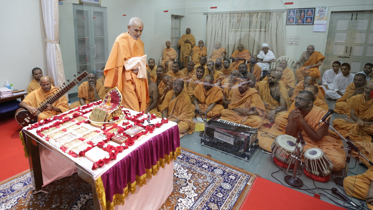 Swamishri engrossed in darshan of Shri Guru Parampara