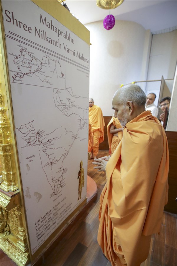 Swamishri observes a map showing Shri Nilkanth Varni's pilgrimage throughout India