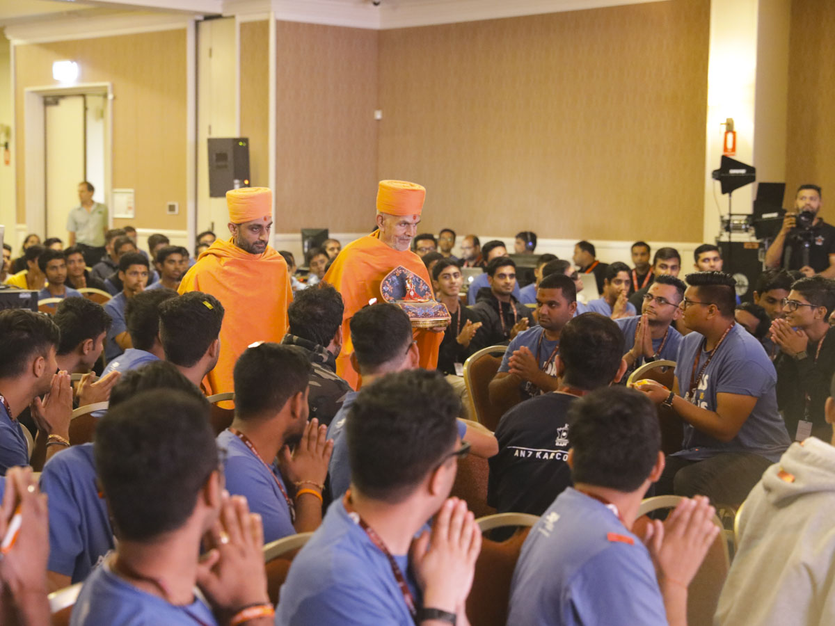 Swamishri arrives in the convention hall with Shri Harikrishna Maharaj