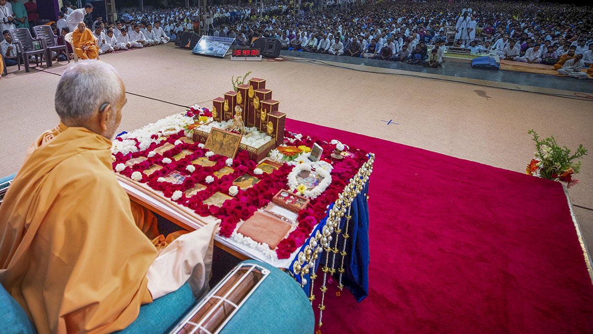 Swamishri performs pujan of Brahmaswarup Pramukh Swami Maharaj's murti in the assembly hall