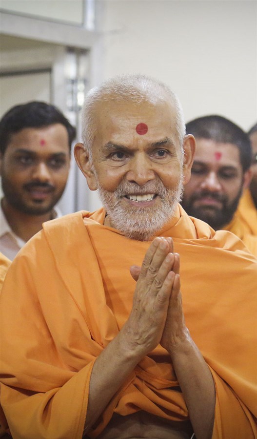 Param Pujya Mahant Swami Maharaj greets devotees with 'Jai Swaminarayan', Akshar Farm, Anand