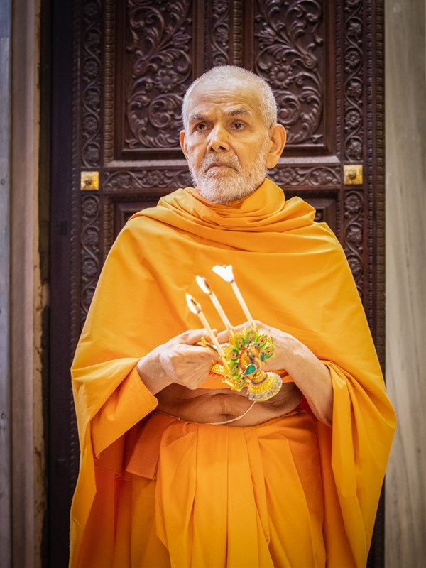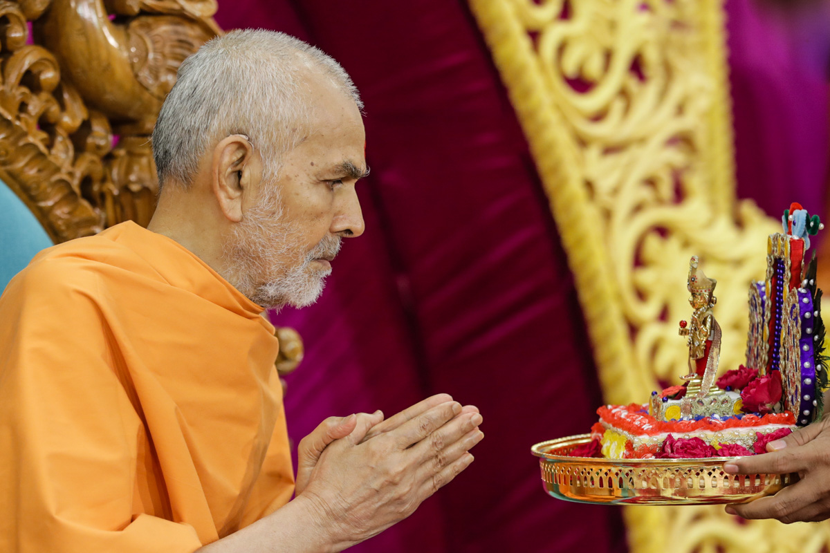 Swamishri does darshan of Shriji Maharaj's murti on the Shikshapatri