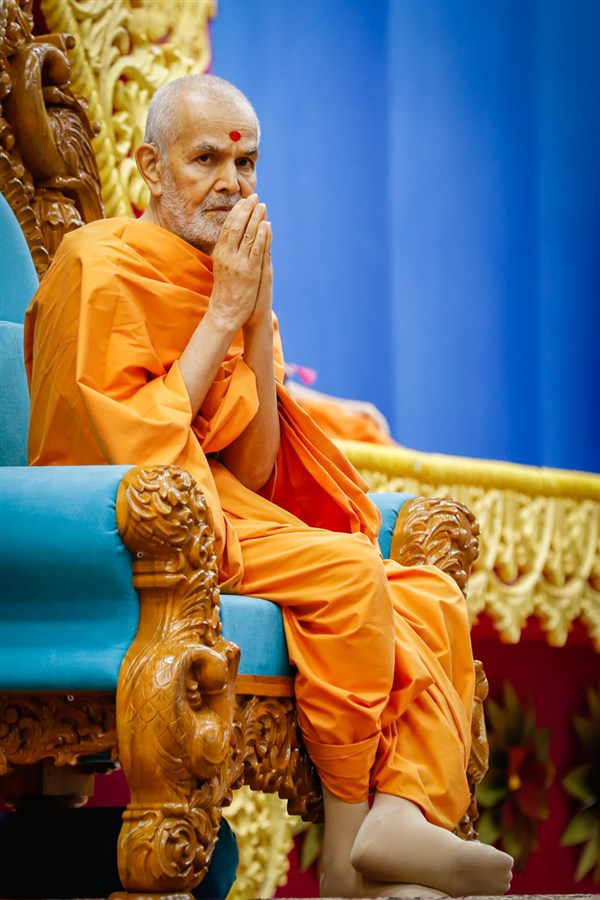 Swamishri greets devotees with 'Jai Swaminarayan'