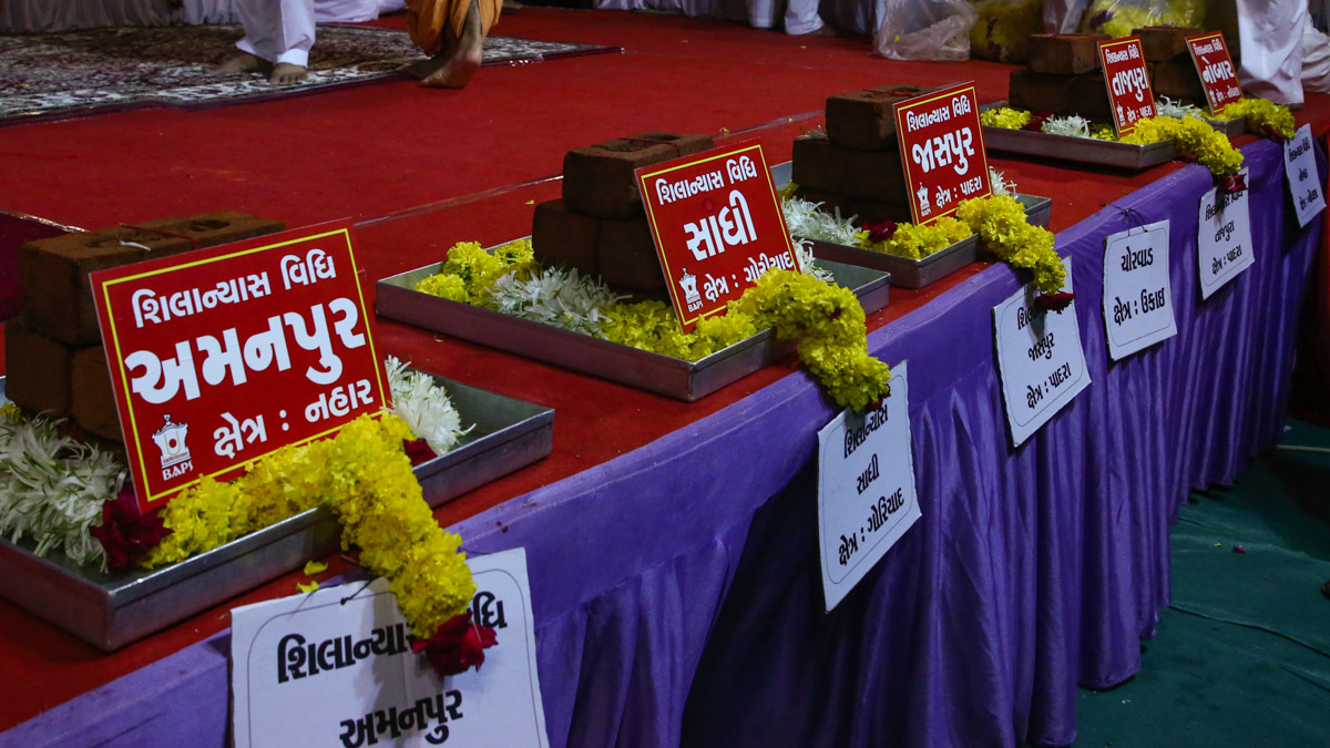 Bricks for shilanyas of BAPS Shri Swaminarayan Mandirs in Amanpur, Sadhi, Jaspur, Tajpur, Nobar, India