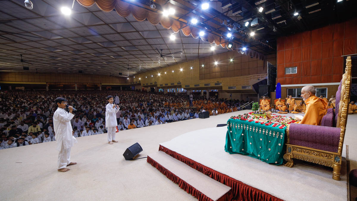 Pujya Swayamprakash Swami (Pujya Doctor Swami) addresses the morning assembly