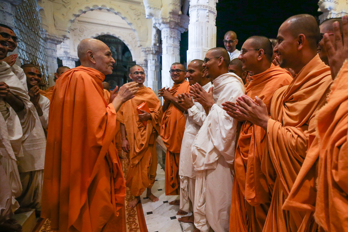 Swamishri greets sadhus and parshads with 'Jai Swaminarayan'