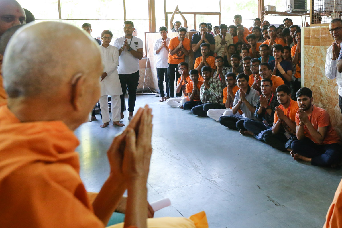 Swamishri greets volunteers with 'Jai Swaminarayan'