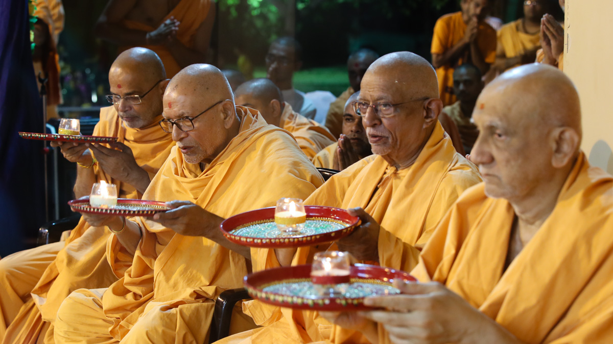 Pujya Swayamprakash Swami (Doctor Swami), Pujya Bhaktipriya Swami (Kothari Swami) and Pujya Viveksagar Swami doing Swamishri's puja darshan
