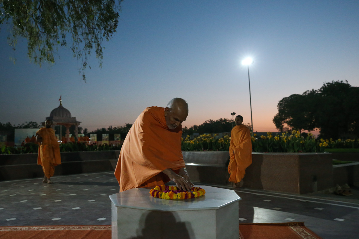 Swamishri engrossed in darshan of Brahmaswarup Pramukh Swami Maharaj's samadhi