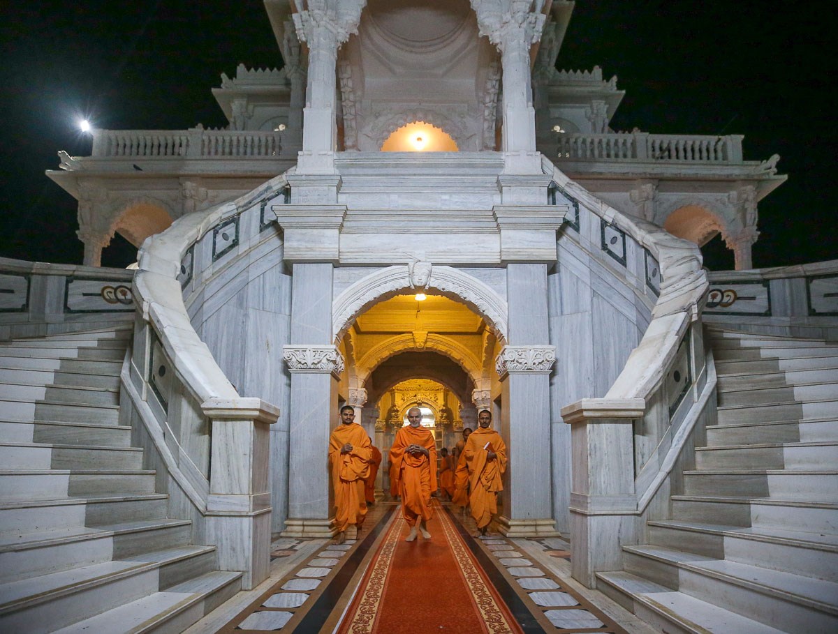 Param Pujya Mahant Swami Maharaj performs pradakshina of the holy charanarvind of Bhagwan Swaminarayan