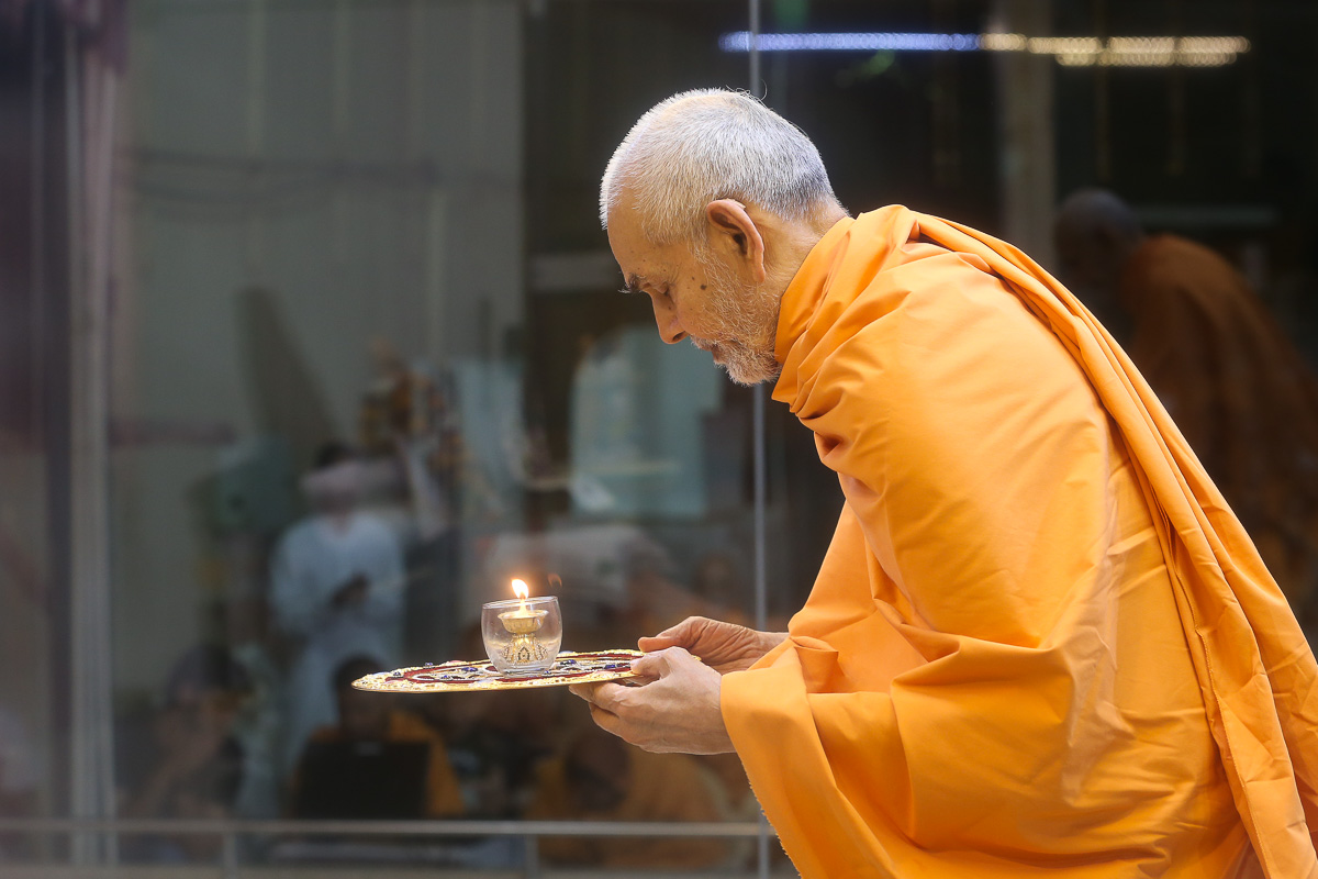 Swamishri performs the evening arti in the Pramukh Mandiram