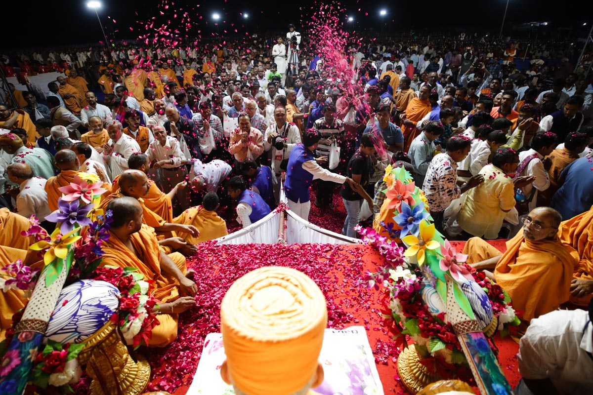 Devotees showered with sanctified flower petals as they pass by Swamishri
