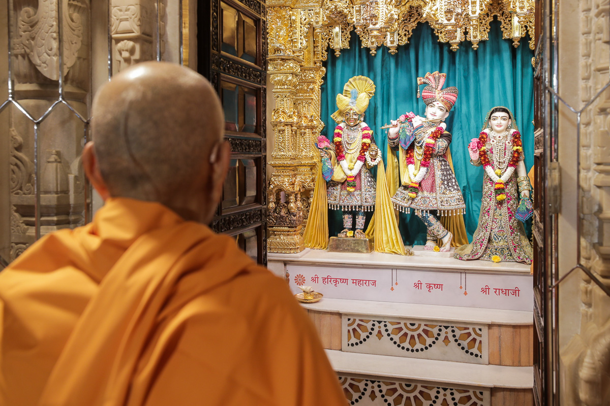 Swamishri engrossed in darshan of Shri Harikrishna Maharaj and Shri Radha-Krishna Dev