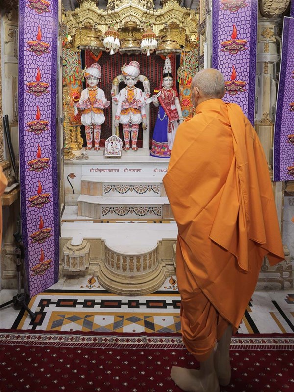 Swamishri doing darshan in the room of gurus Brahmaswarup Shastriji Maharaj, Brahmaswarup Yogiji Maharaj and Brahmaswarup Pramukh Swami Maharaj