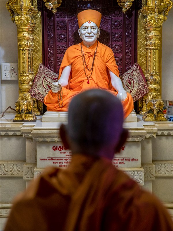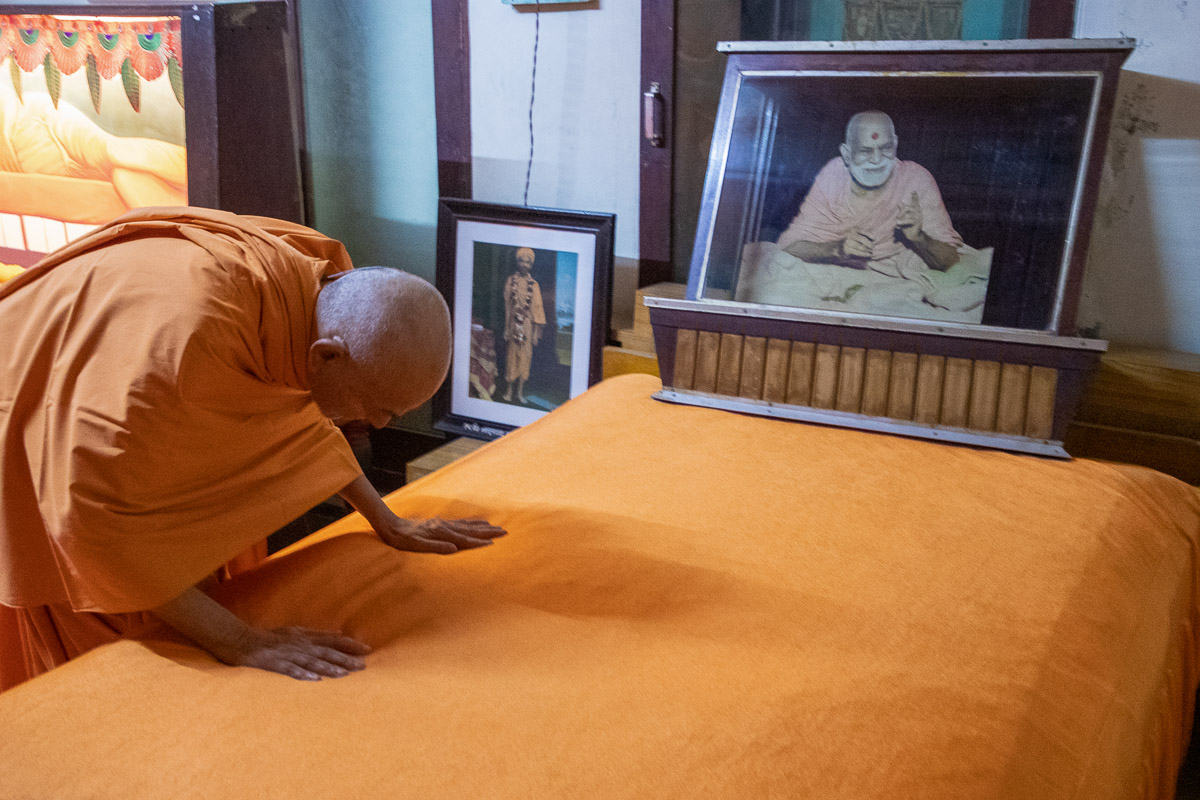 Swamishri doing darshan in the room of gurus Brahmaswarup Shastriji Maharaj, Brahmaswarup Yogiji Maharaj and Brahmaswarup Pramukh Swami Maharaj