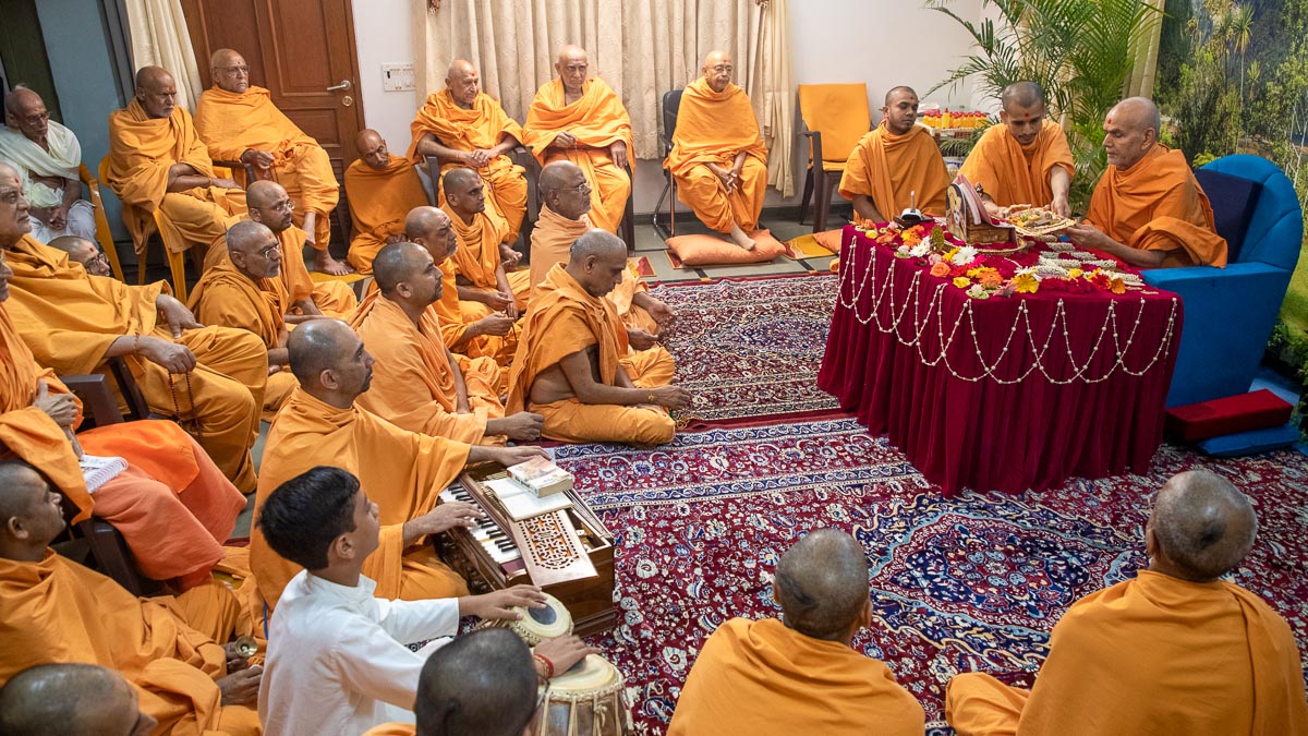Swamishri blesses sadhus in the room of gurus Brahmaswarup Shastriji Maharaj, Brahmaswarup Yogiji Maharaj and Brahmaswarup Pramukh Swami Maharaj