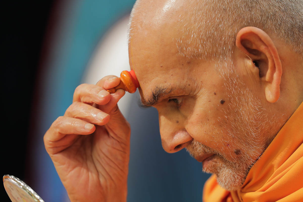 Swamishri applies tilak on his forehead at the beginning of his daily puja