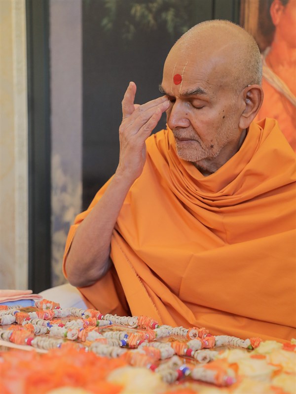 Param Pujya Mahant Swami Maharaj performs the morning arti