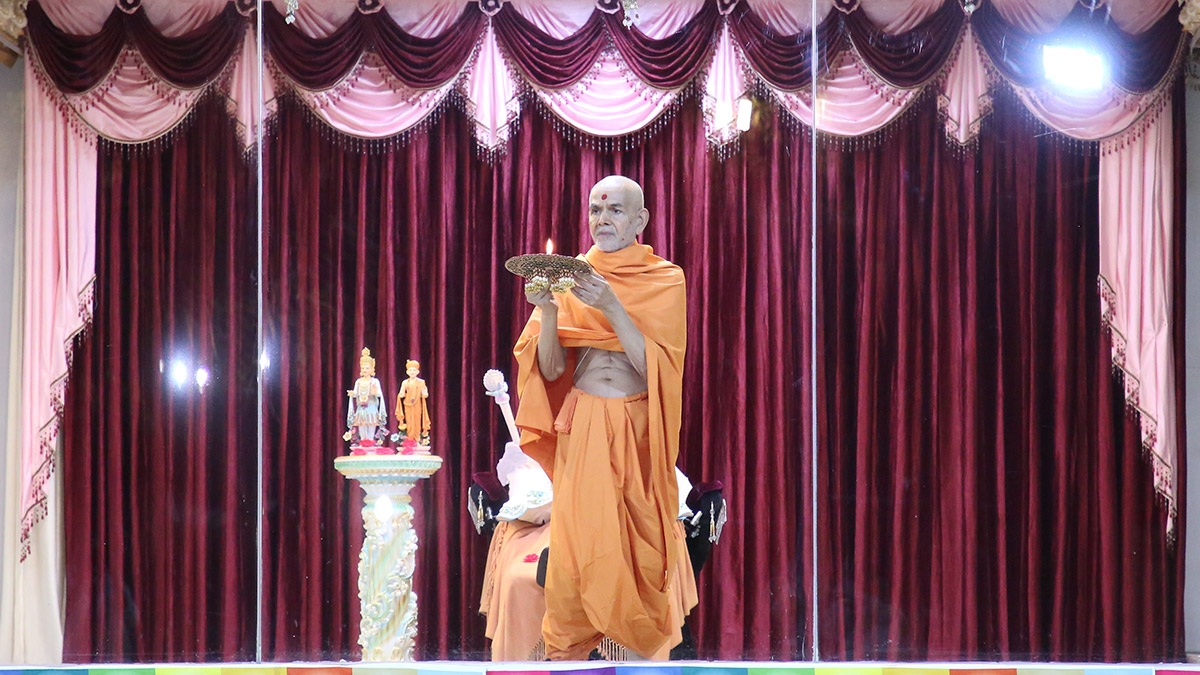 Swamishri performs the evening arti in the Pramukh Mandiram