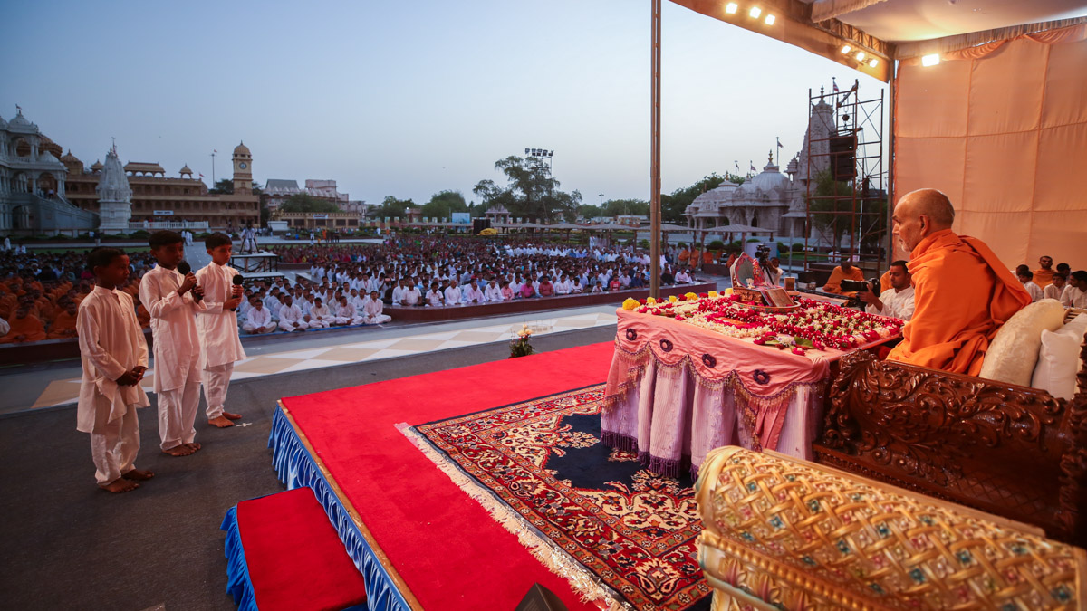 Pujya Swayamprakash Swami addresses the evening satsang assembly
