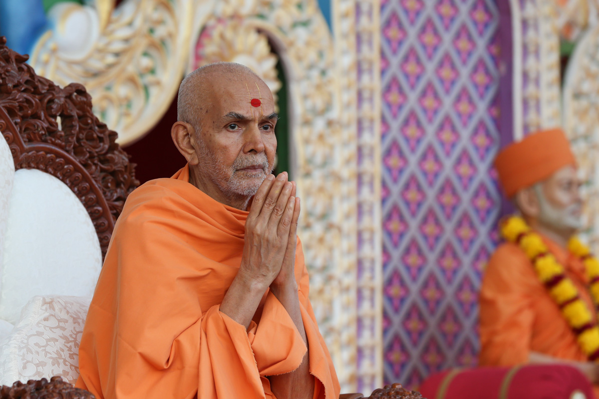 Swamishri performs the evening arti in the Pramukh Mandiram