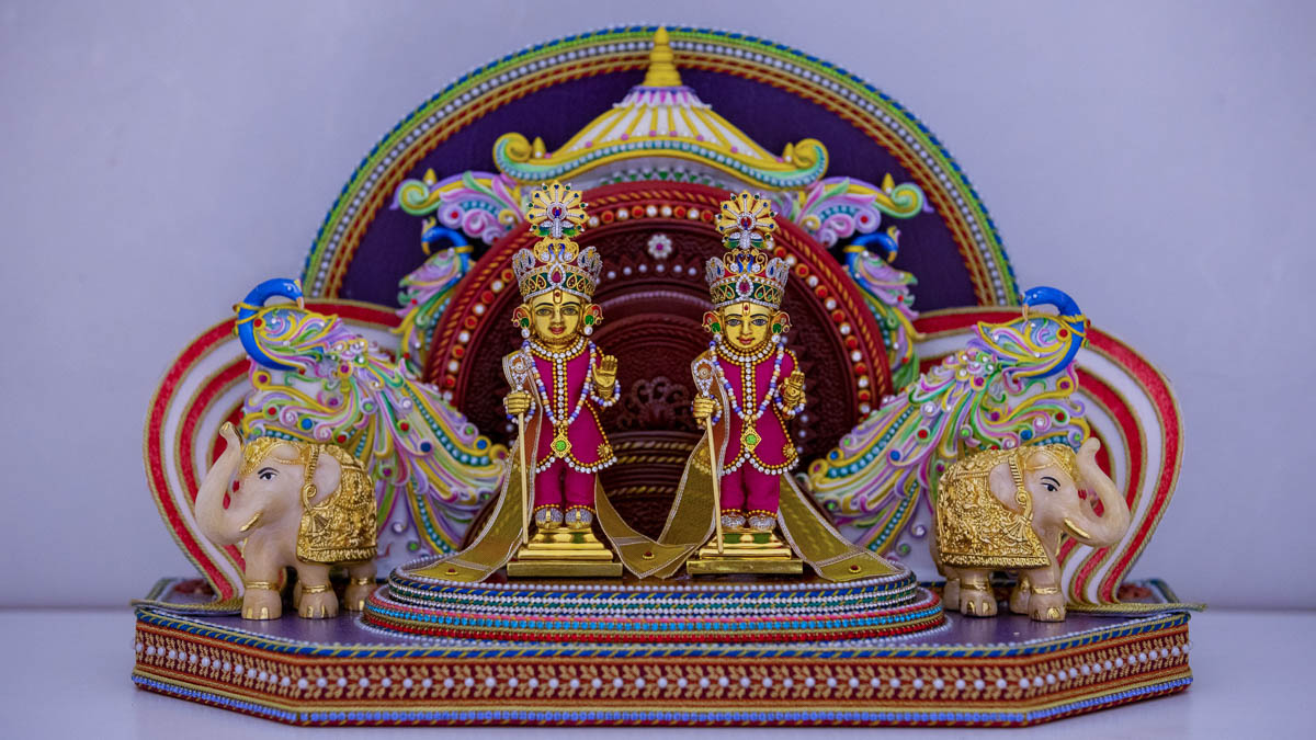 Flowers are offered to Shri Harikrishna Maharaj and Shri Gunatitanand Swami