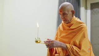 Param Pujya Mahant Swami Maharaj performs the morning arti
