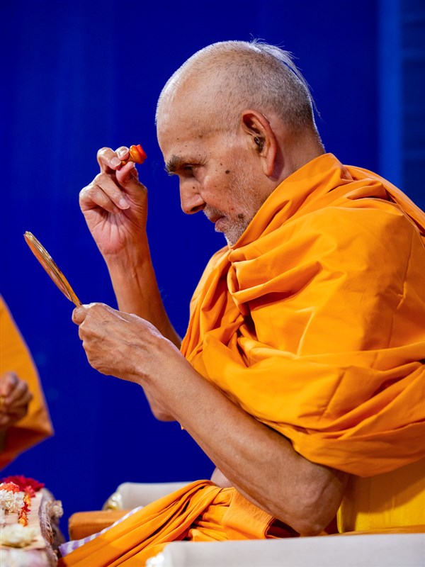 Swamishri applies a tilak on his forehead