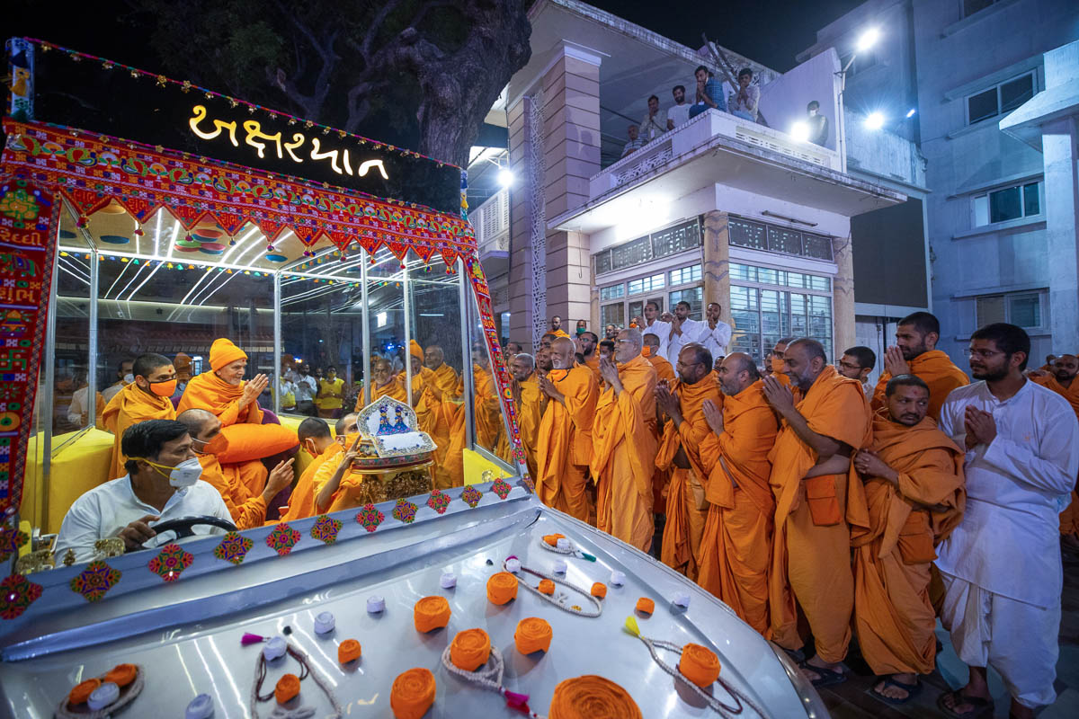 Param Pujya Mahant Swami Maharaj on his way to perform his daily puja