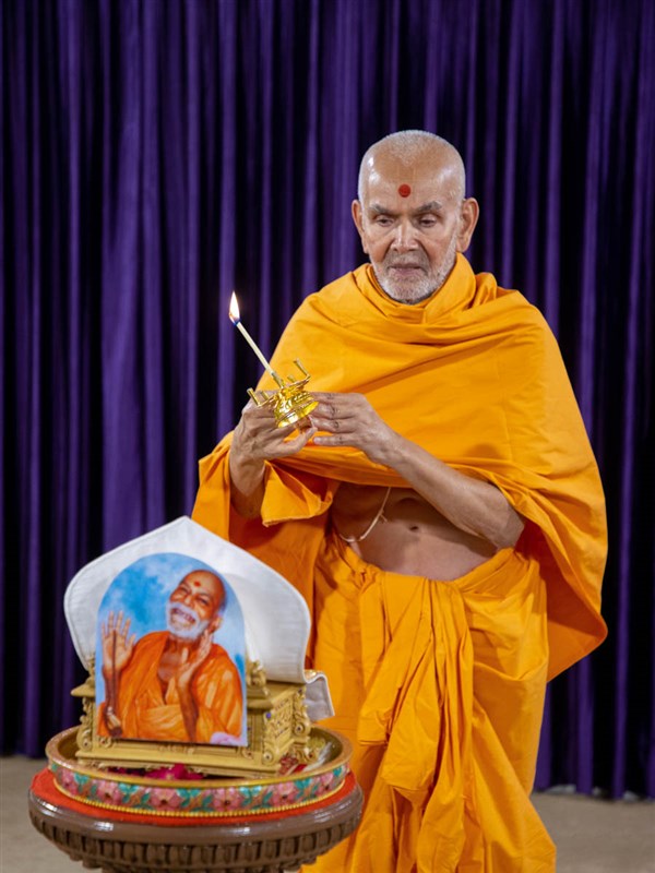 Param Pujya Mahant Swami Maharaj performs the morning arti