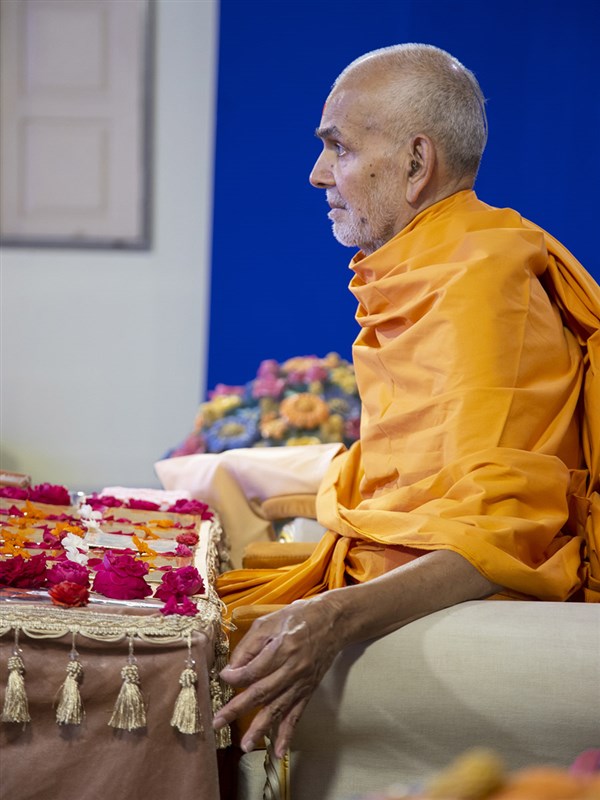 Swamishri engrossed in darshan of Shri Akshar-Purushottam Maharaj